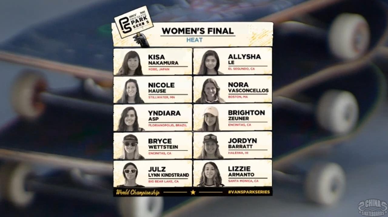 2016 Vans职业公园滑板赛女子组世界锦标赛——60分钟决赛完整视频发布!女神Lizzie Armanto, Kisa Nakamura,Allysha Le, Nicole Hause等10位全球顶级的女滑手在碗池中展开激烈的角逐,冠军最后由年仅12岁的Brighton Zeuner夺得!