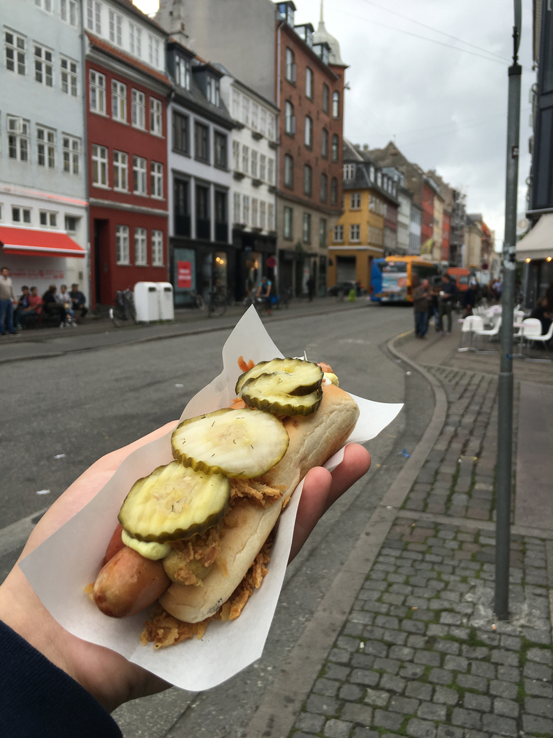 强烈推荐!番茄酱+芥末+炸洋葱+酸黄瓜热狗。