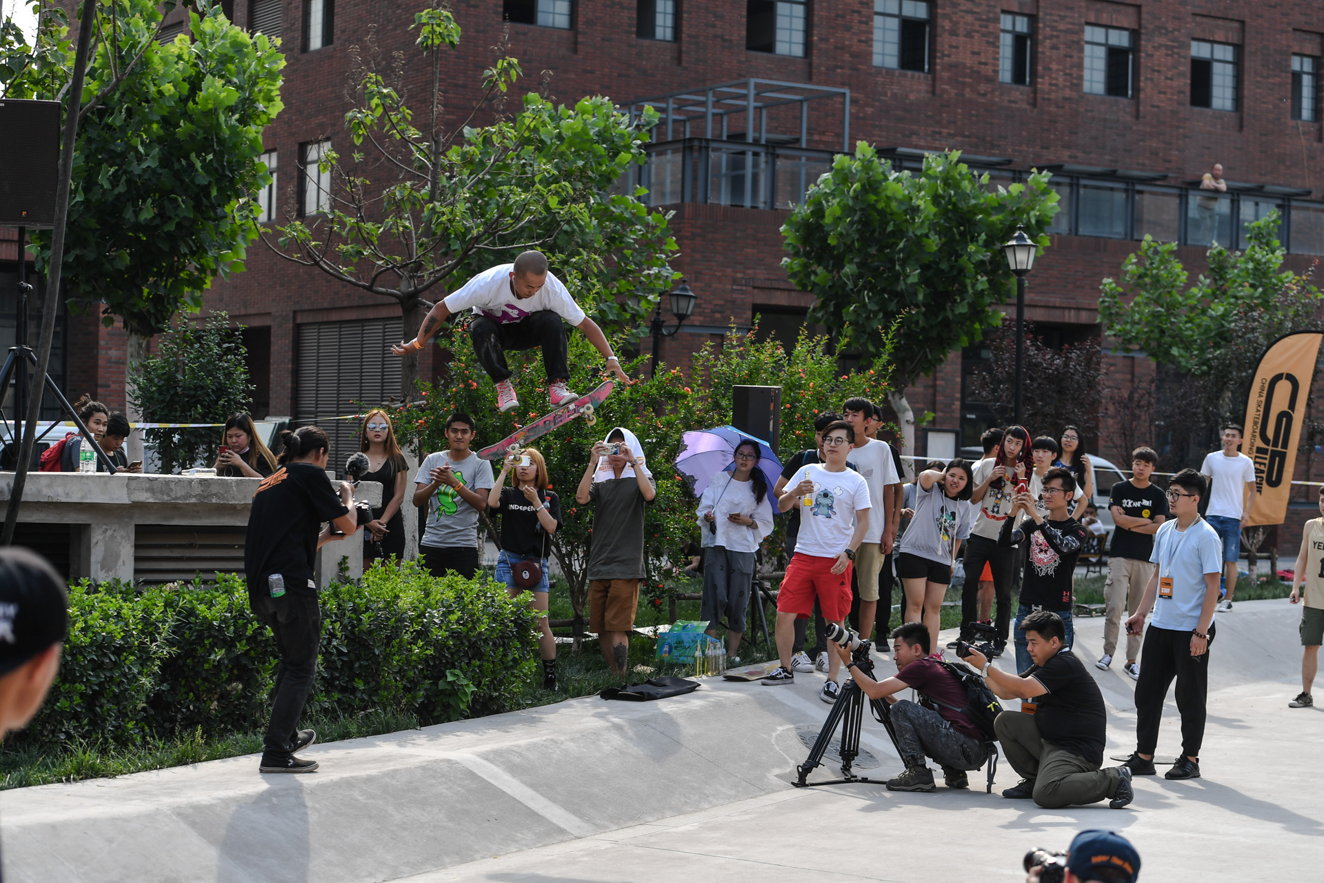 同时现场300多位观众也顶着烈日,自始至终为滑手们加油助威,更有滑手粉丝组团来到现场,成为赛场上一道靓丽的风景线。