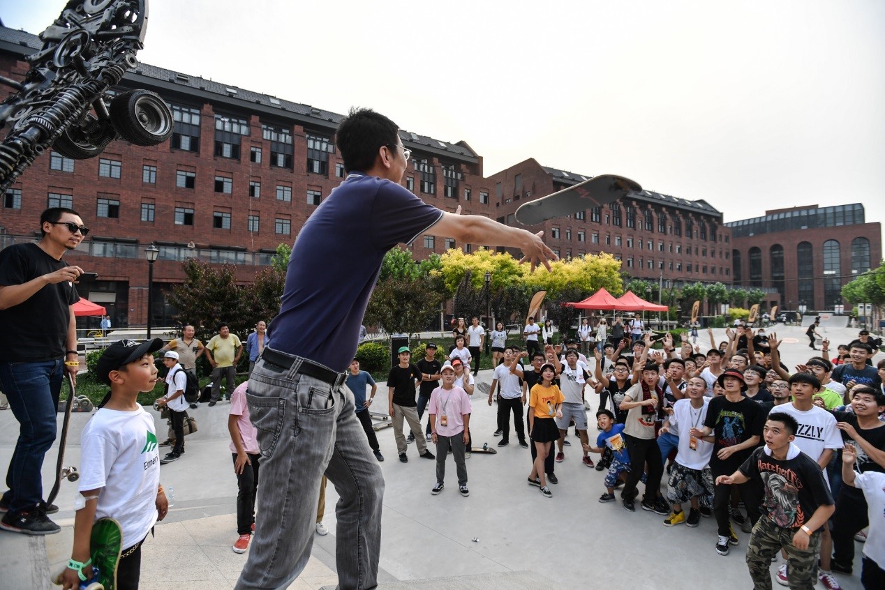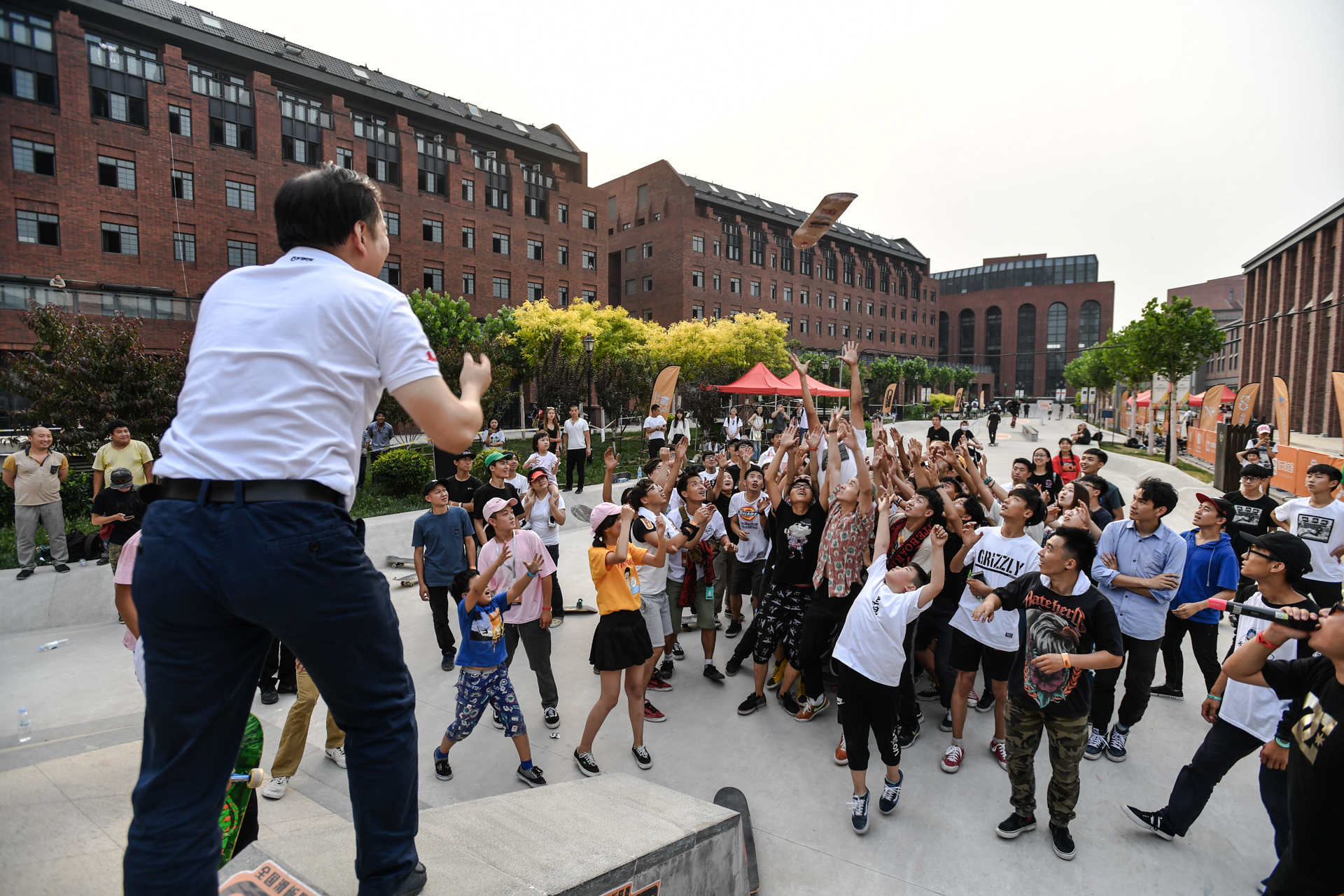 中国轮滑协会秘书长黄强也感受到了现场的活跃气氛,抛出了他在滑板场上第一个奖品。