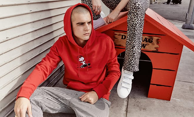 这件帽衫以红色为主打色,点睛之笔在于胸前滑滑板的史努比图案