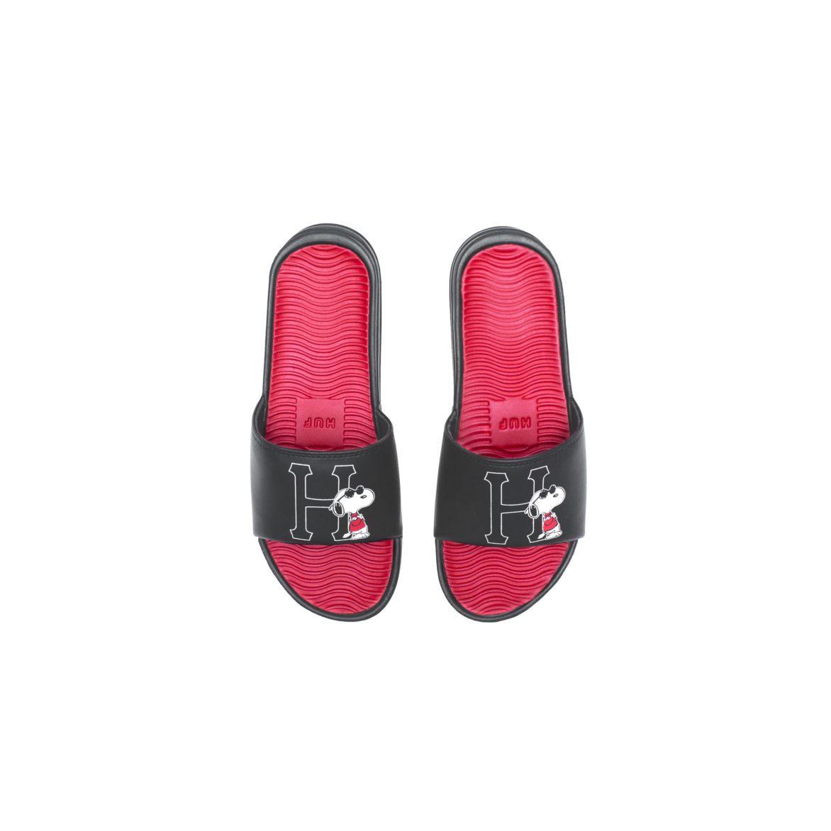 标志性HUF大logo,以及靠在一旁的戴墨镜的史努比,采用波浪纹防滑设计,加上一小块HUF鞋标,穿上这双拖鞋,做最靓的仔