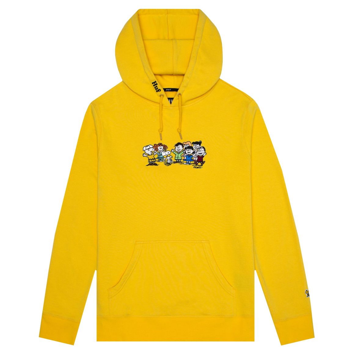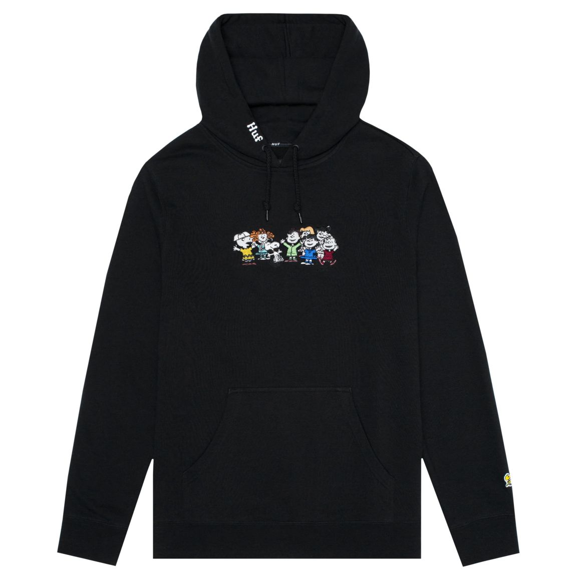 帽衫黑/黄两色可供选择,图案为查理和他的好朋友们,以及史努比!抽绳处有HUF黑标,左边袖口印有黄色小鸟——史努比好朋友WoodStock