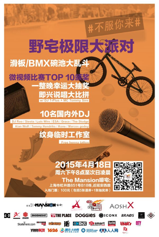 4月18日在SMP滑板公园的Action Time大赛现场找到the mansion DJ舞台购买'野宅极限大派对'门票,额外附送价值200元WEG大赛门票一张!